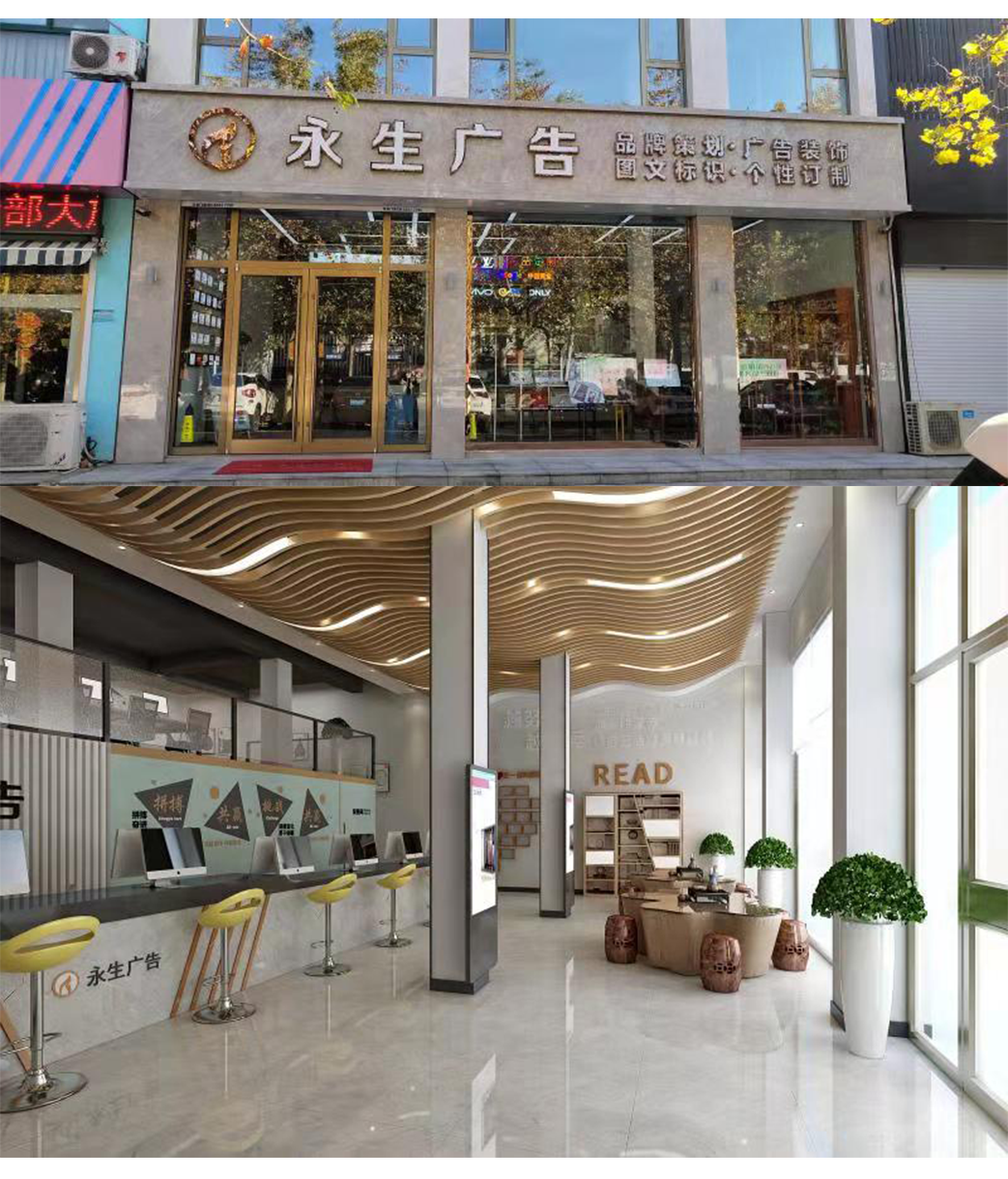 公司自有數(shù)碼沖床設(shè)備、500W光纖機、高精度大幅面噴繪機、寫真機、UV機、多種大小型雕刻機、吸塑機、全自動圍字機、自動開槽機、激光焊接機、拋光機等生產(chǎn)加工設(shè)備,擁有完善的設(shè)計團隊、技術(shù)團隊、施工團隊、售后團隊,可為廣大客戶提供室內(nèi)裝修、店招門頭、精神堡壘、黨建標(biāo)識、標(biāo)識標(biāo)牌、宣傳欄、LED顯示屏、警示標(biāo)識、精品字、證卡胸牌、證書獎杯、燈箱、桌牌、定制禮品、展具、噴印等多種專業(yè)廣告服務(wù)...